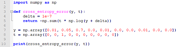log是底為e的自然對數(loge),跟均方誤差一樣y為輸出t為答案。