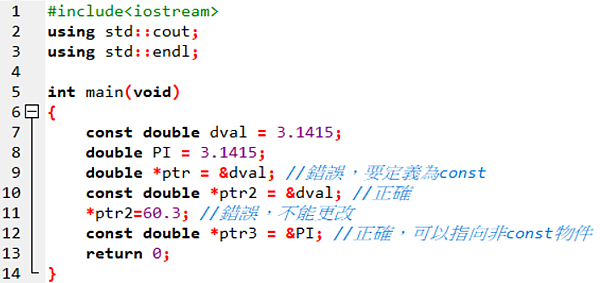 跟參考一樣,必須要是const的指標才能指向const的物件,當然const的指標也可以指向非const物件。