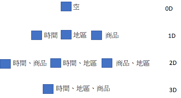 從資料倉儲查詢出的結果稱為晶格(lattice),所以3個維度就有8個晶格(藍色的方塊)。