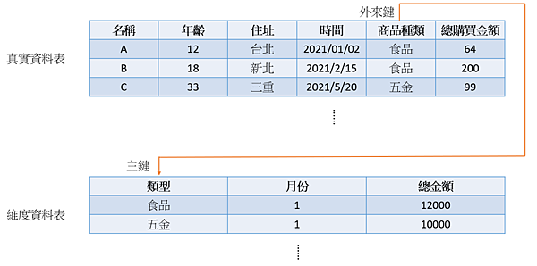 由「真實資料表」&「維度資料表」所組成,兩個的差別在於一個是真實(原汁原味)的資料一個是經過統整(後期加工)的資料。