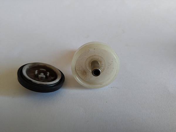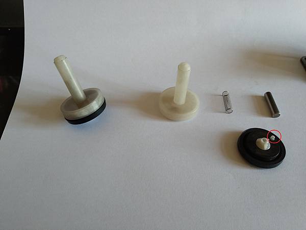 拆開來裡面有兩樣東西,彈簧、鐵柱,可以洗一洗,然後要注意紅色圈圈的位置,塞住就會造成問題,通一通,裝回去後壓一壓,看看是否有回彈,應該就好了。